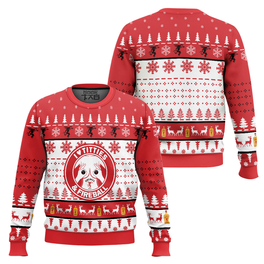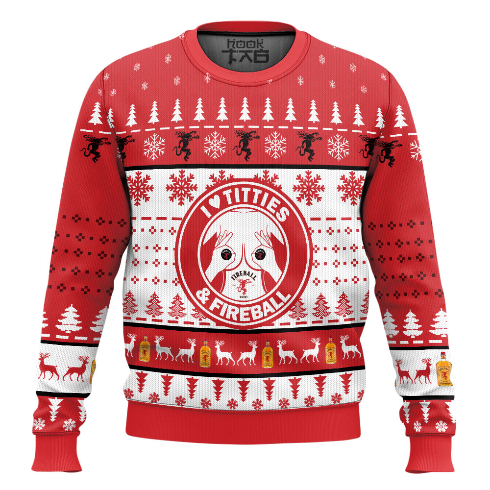Hooktab I Love Titties And Fireball Whiskey Ugly Christmas Sweater