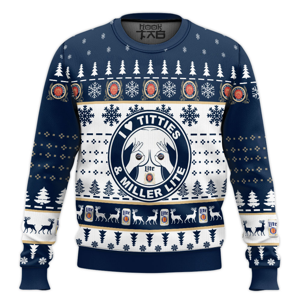 Hooktab I Love Titties And Miller Lite Ugly Christmas Sweater