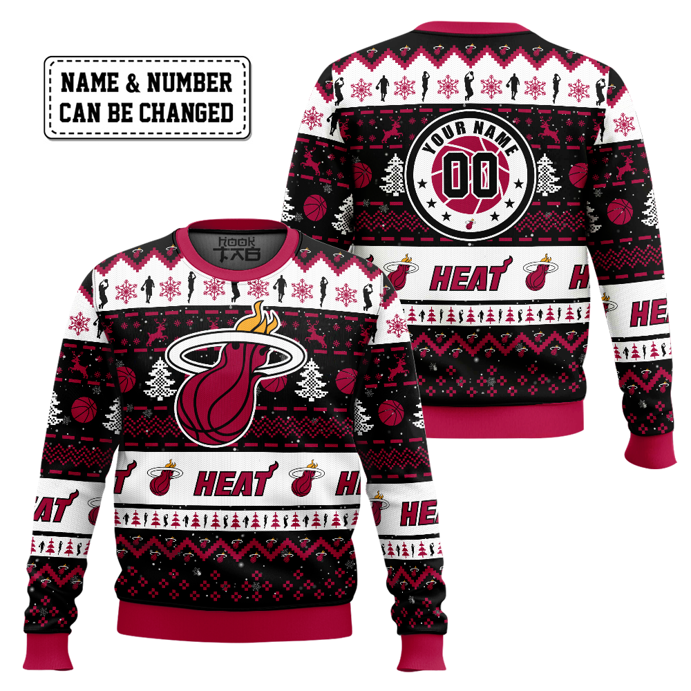 Hooktab NBA Miami Heat Custom Name And Number Ugly Christmas Sweater