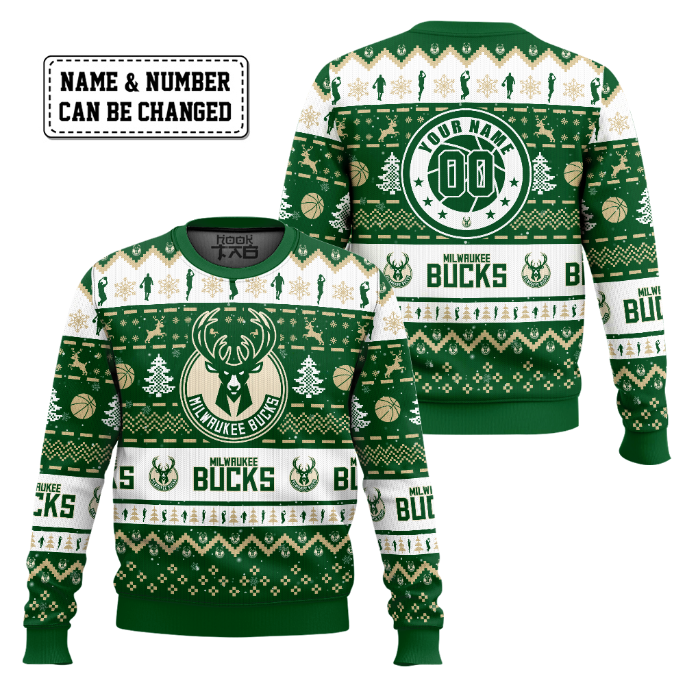 Hooktab NBA Milwaukee Bucks Custom Name And Number Ugly Christmas Sweater