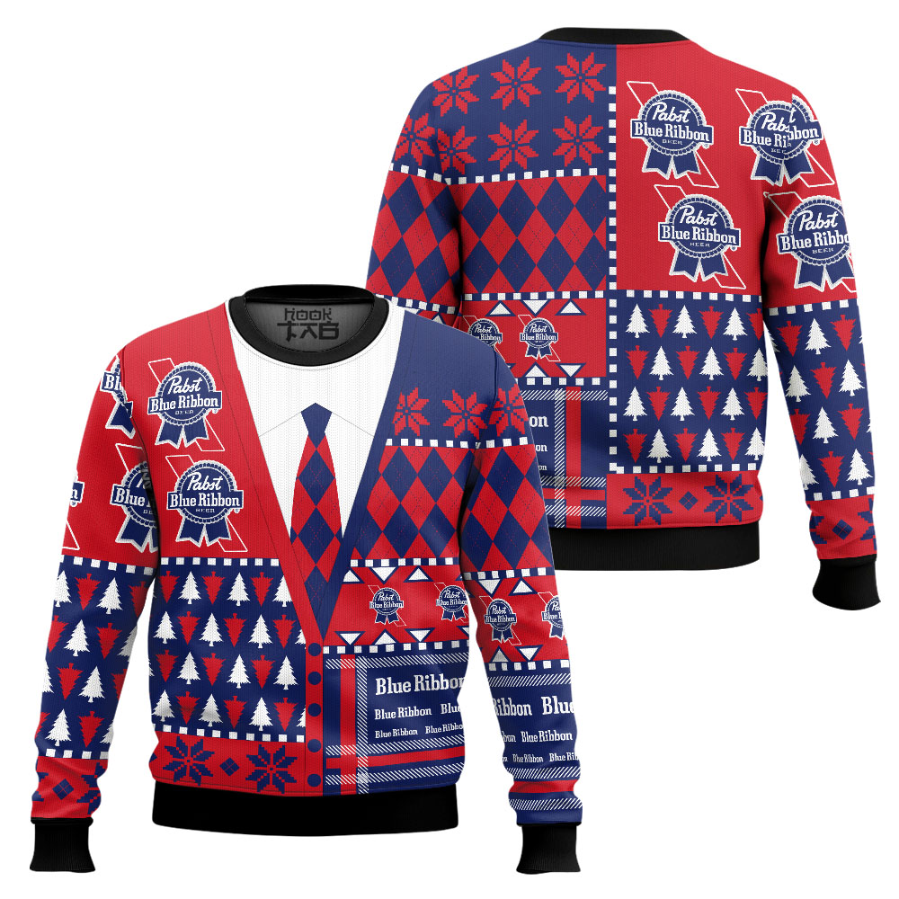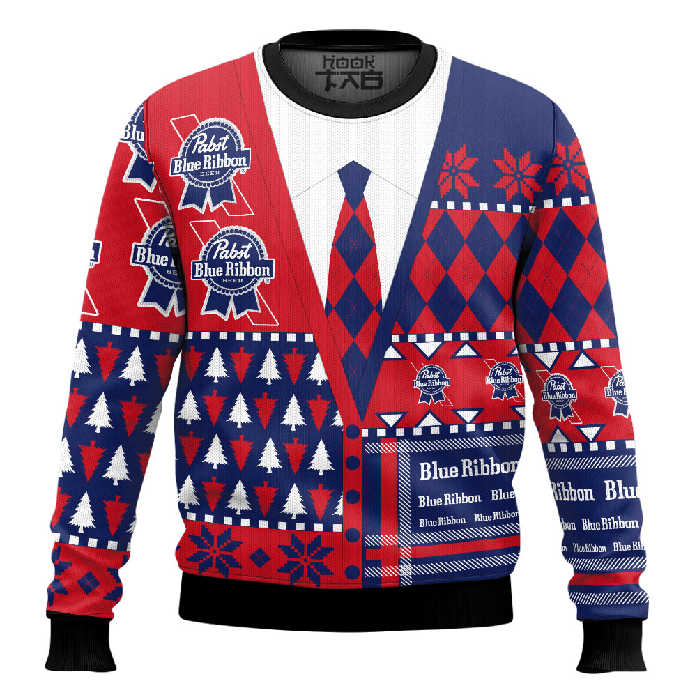 Hooktab Pabst Blue Ribbon Suit And Tie Ugly Christmas Sweater