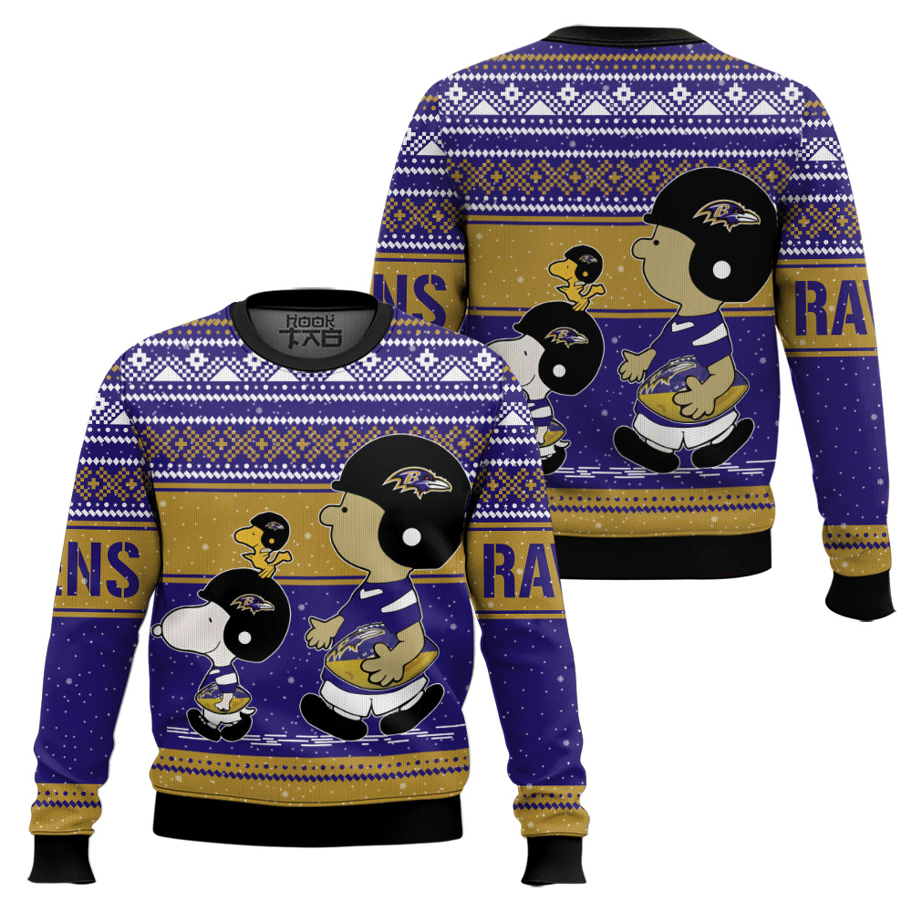 Hooktab Snoopy And Charlie Brown Baltimore Ravens Ugly Sweater