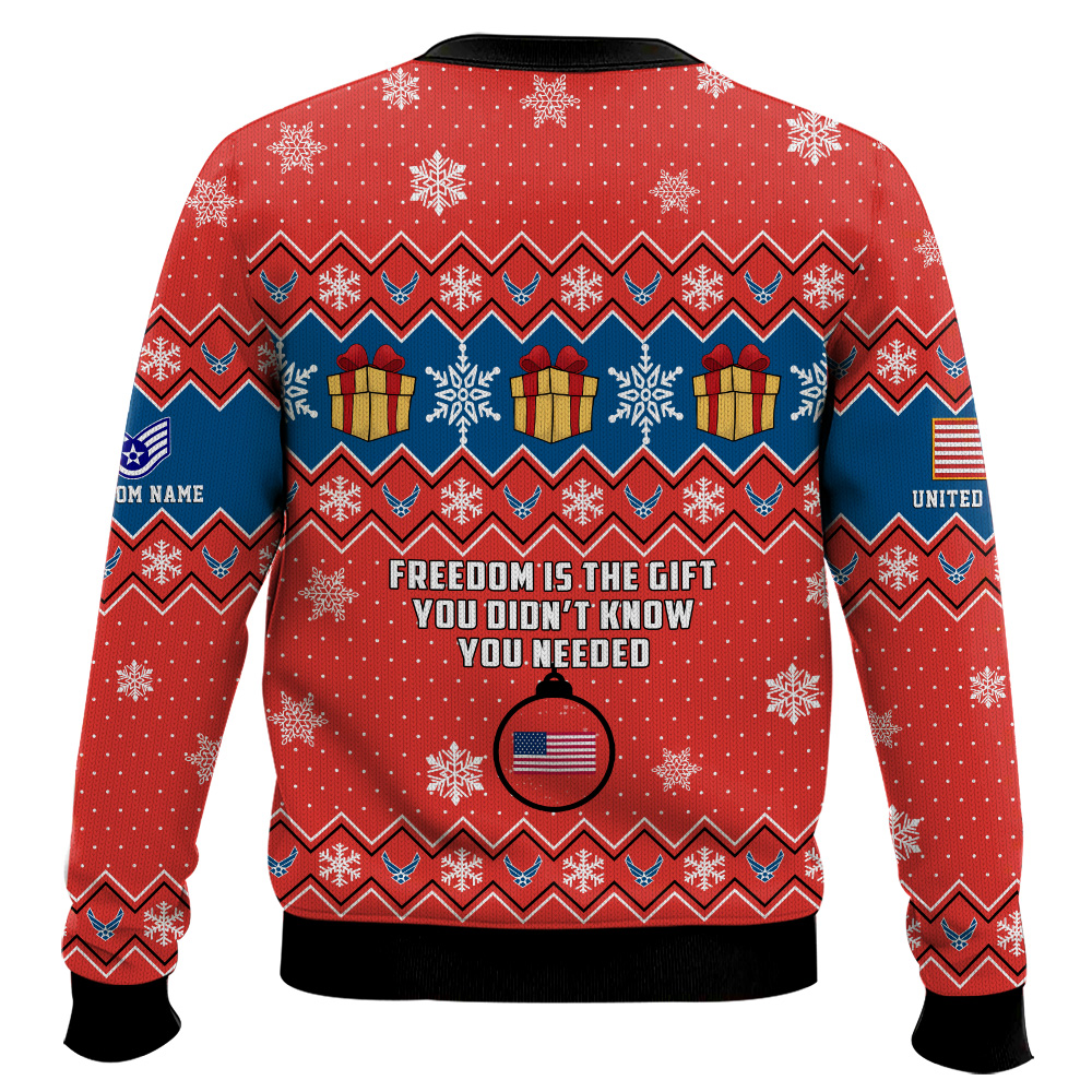 Hooktab US Air Force “Freedom Is The Gift You Didn’t Know You Needed†– Custom Name And Rank Ugly Sweater
