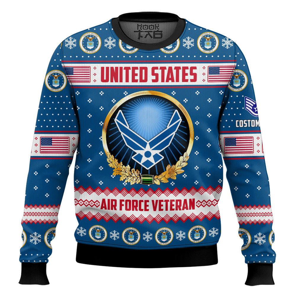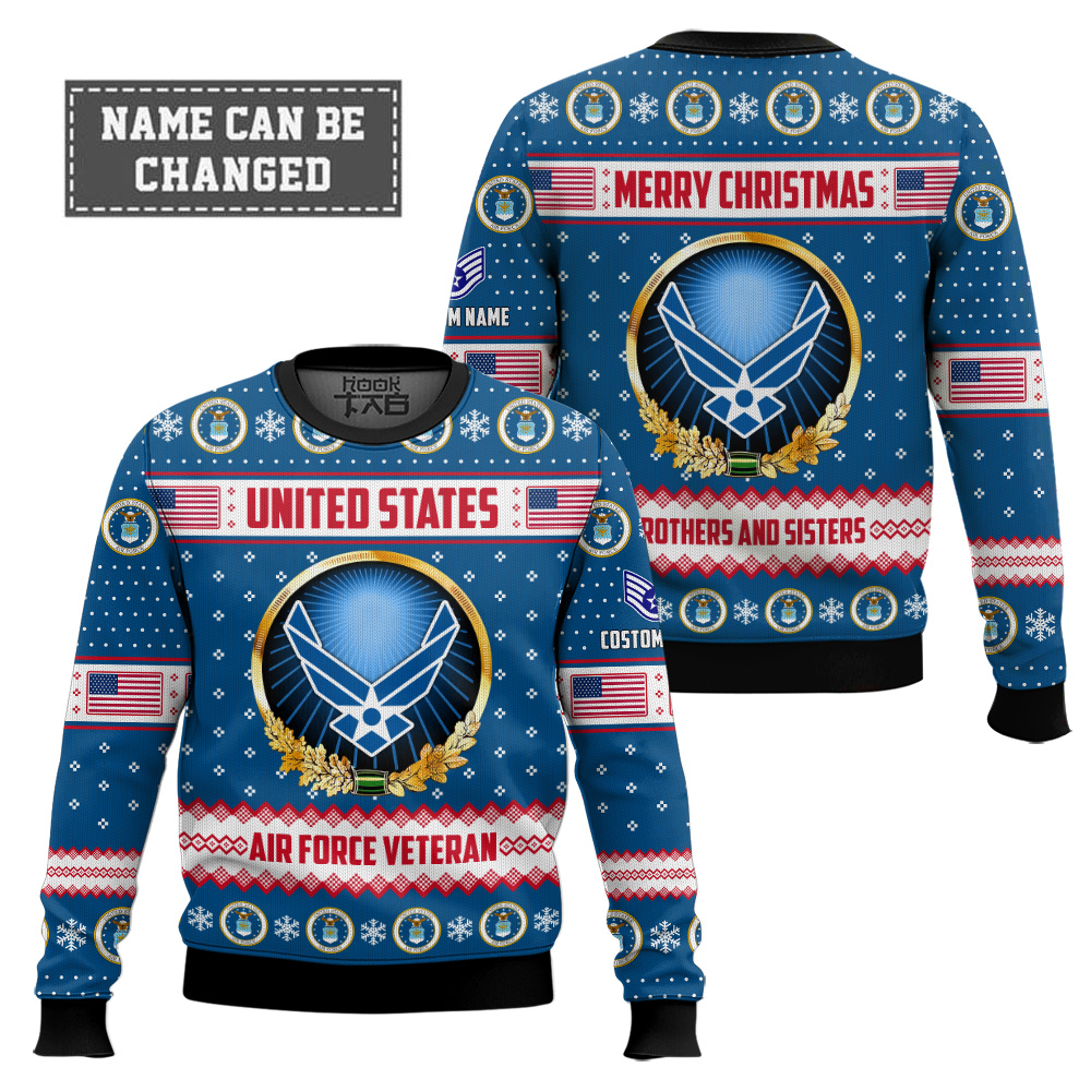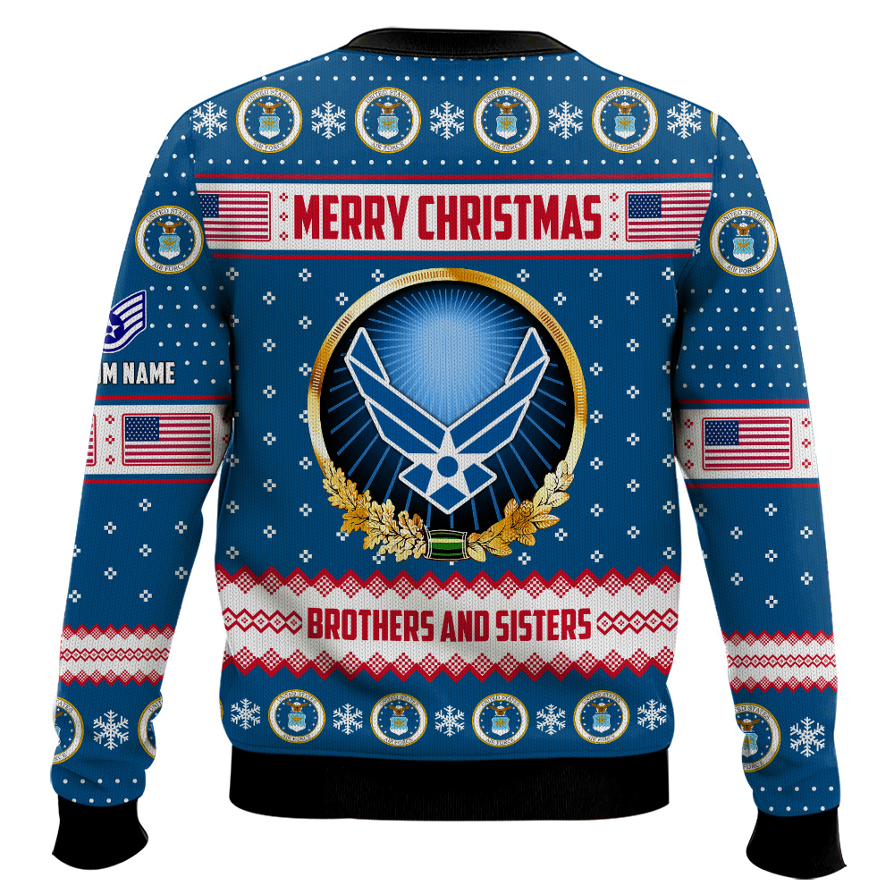 Hooktab US Air Force Merry Christmas Brothers And Sisters – Custom Name And Rank Ugly Sweater