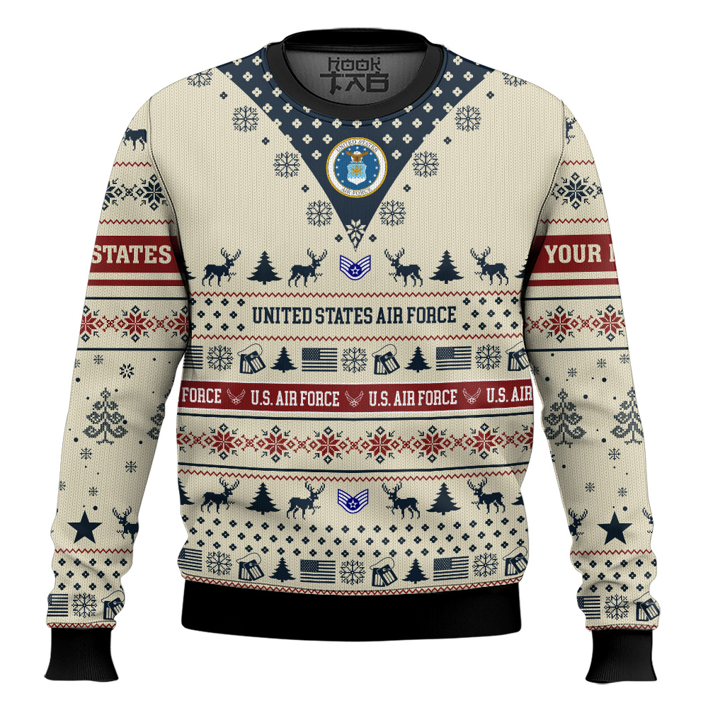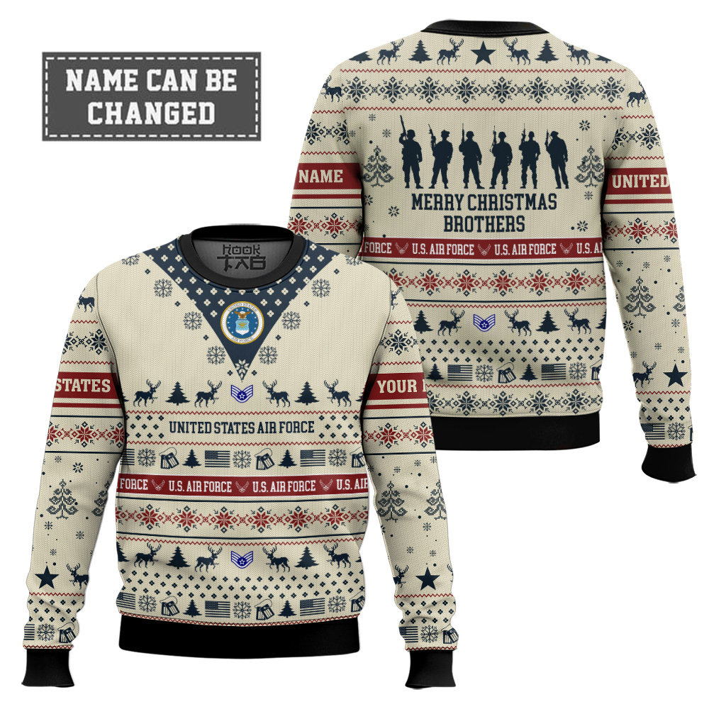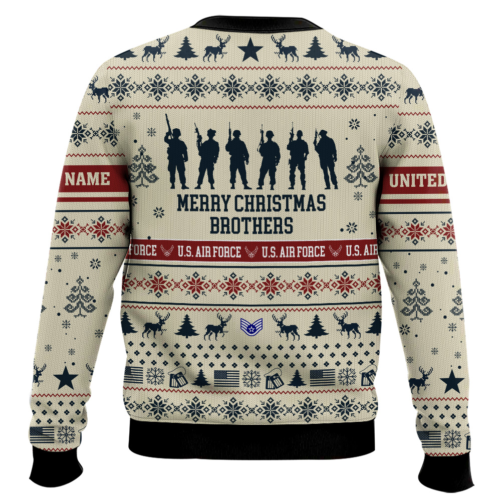 Hooktab US Air Force Merry Christmas Brothers – Custom Name And Rank Ugly Sweater