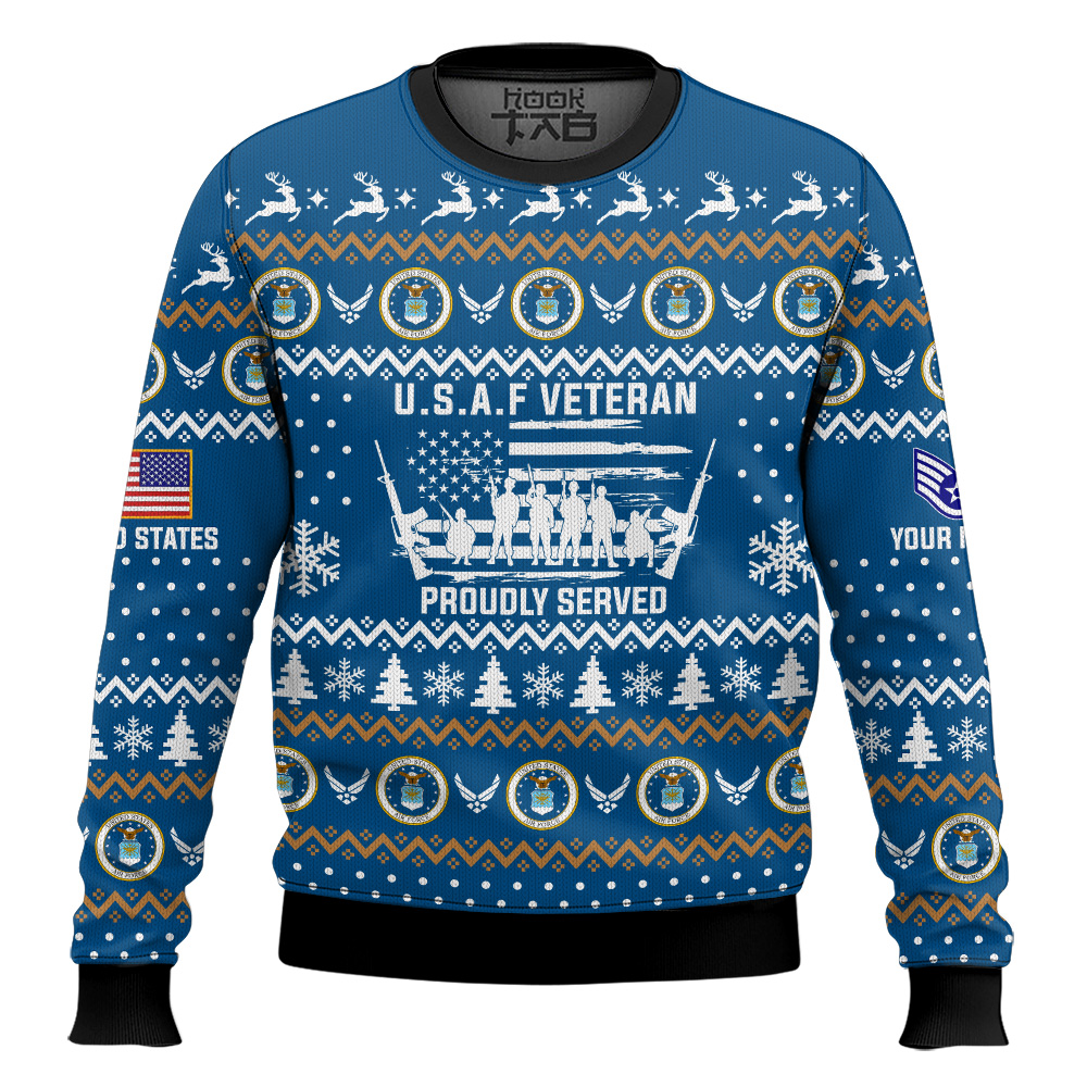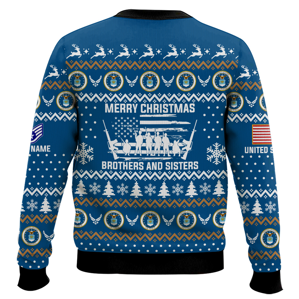 Hooktab US Air Force Merry Xmas Brothers And Sisters – Custom Name And Rank Ugly Sweater