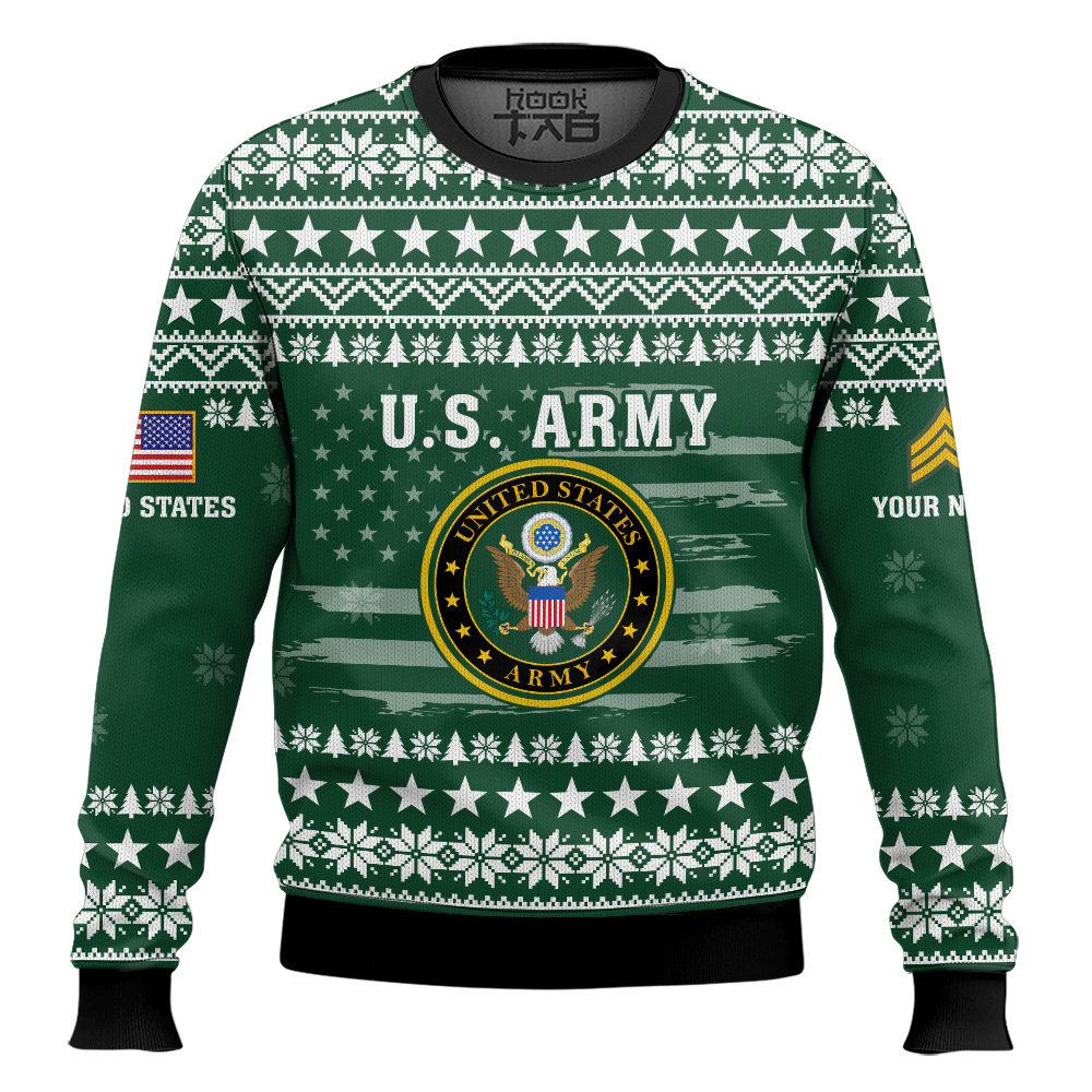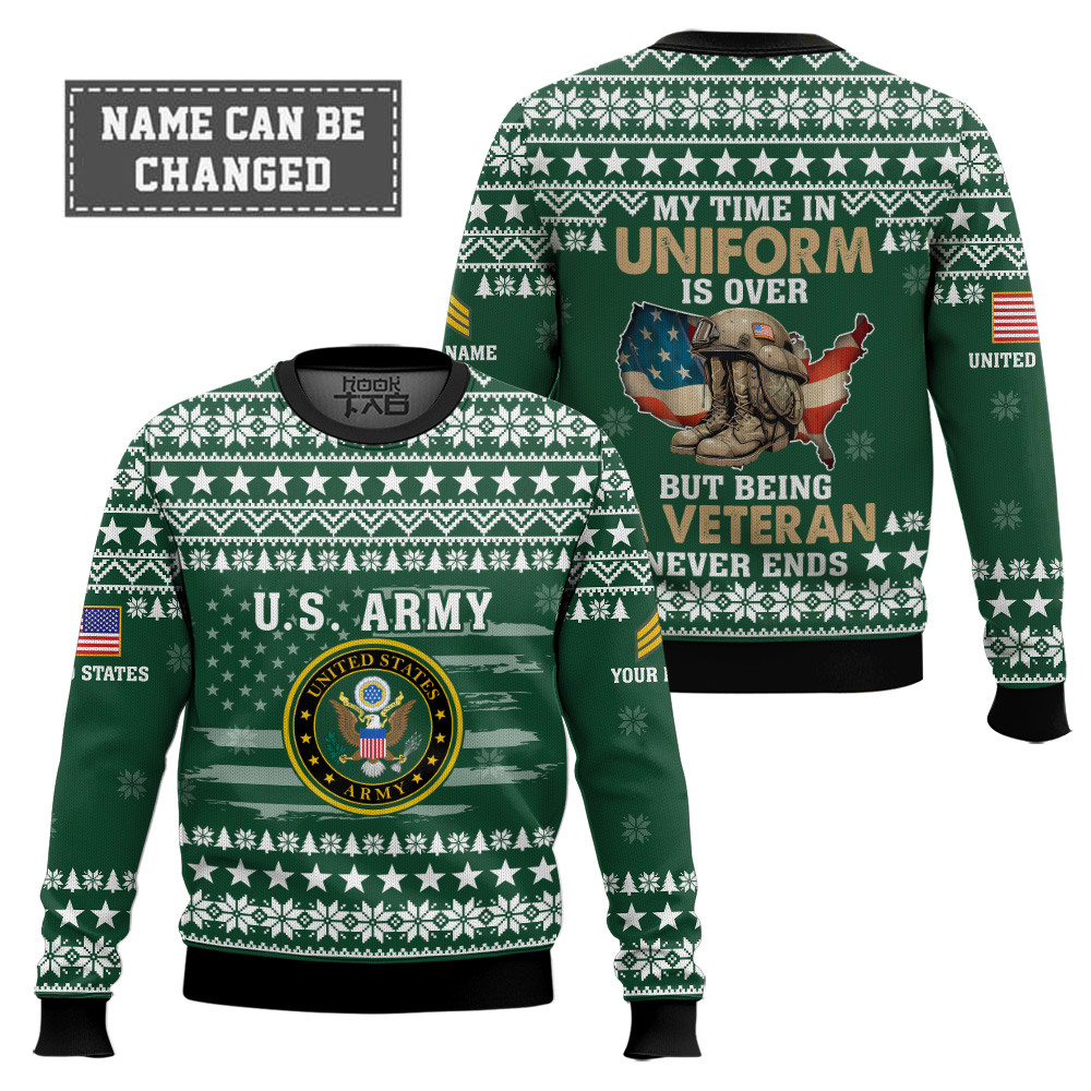 Hooktab US Army My Time In Uniform Is Over But Being A Veteran Never Ends – Custom Name And Rank Ugly Sweater