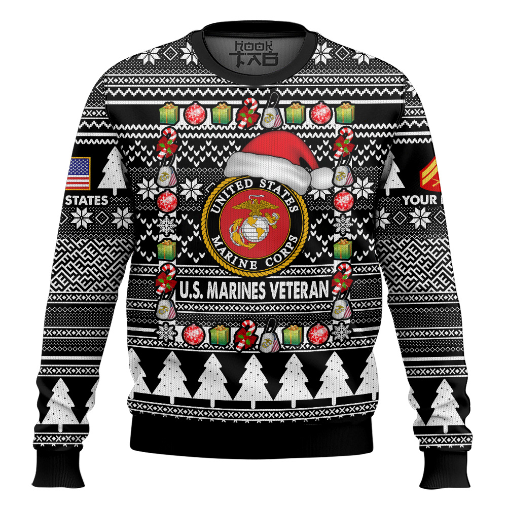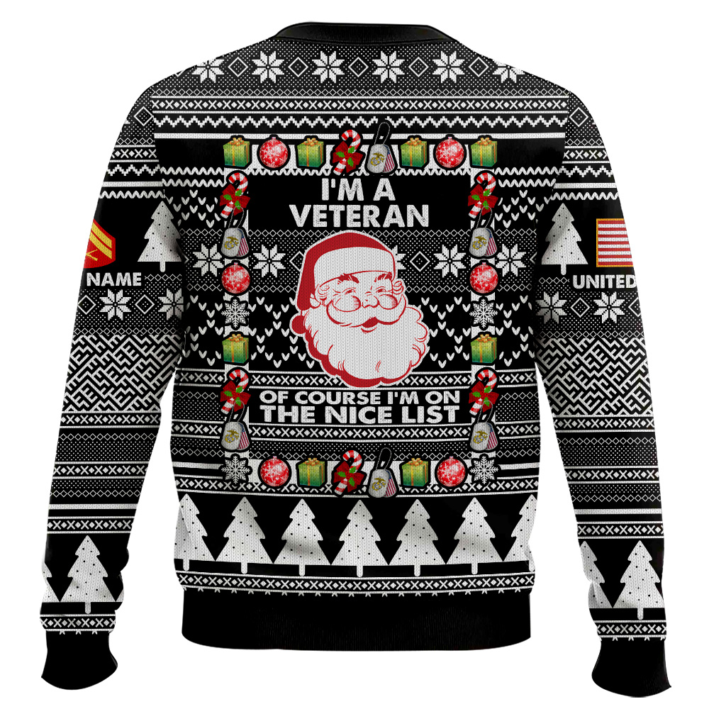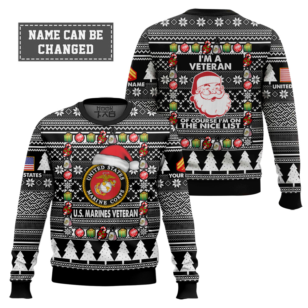Hooktab US Marine Corps I’m A Veteran, Of Course I’m On The Nice List – Custom Name And Rank Ugly Sweater
