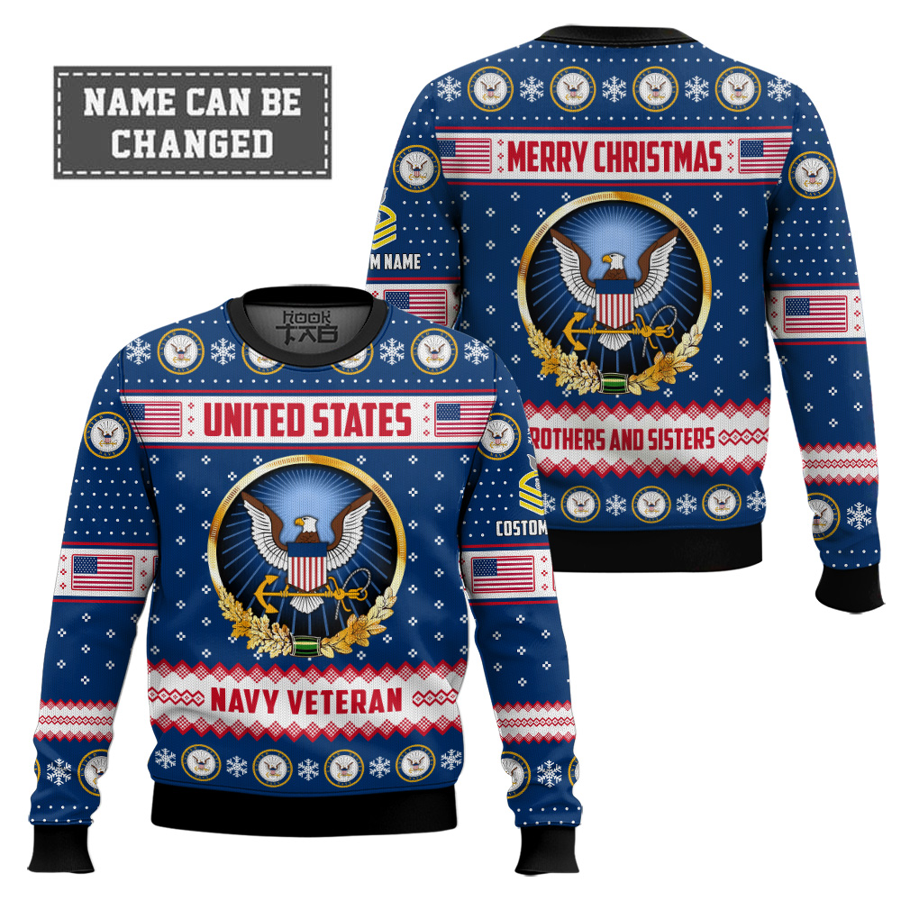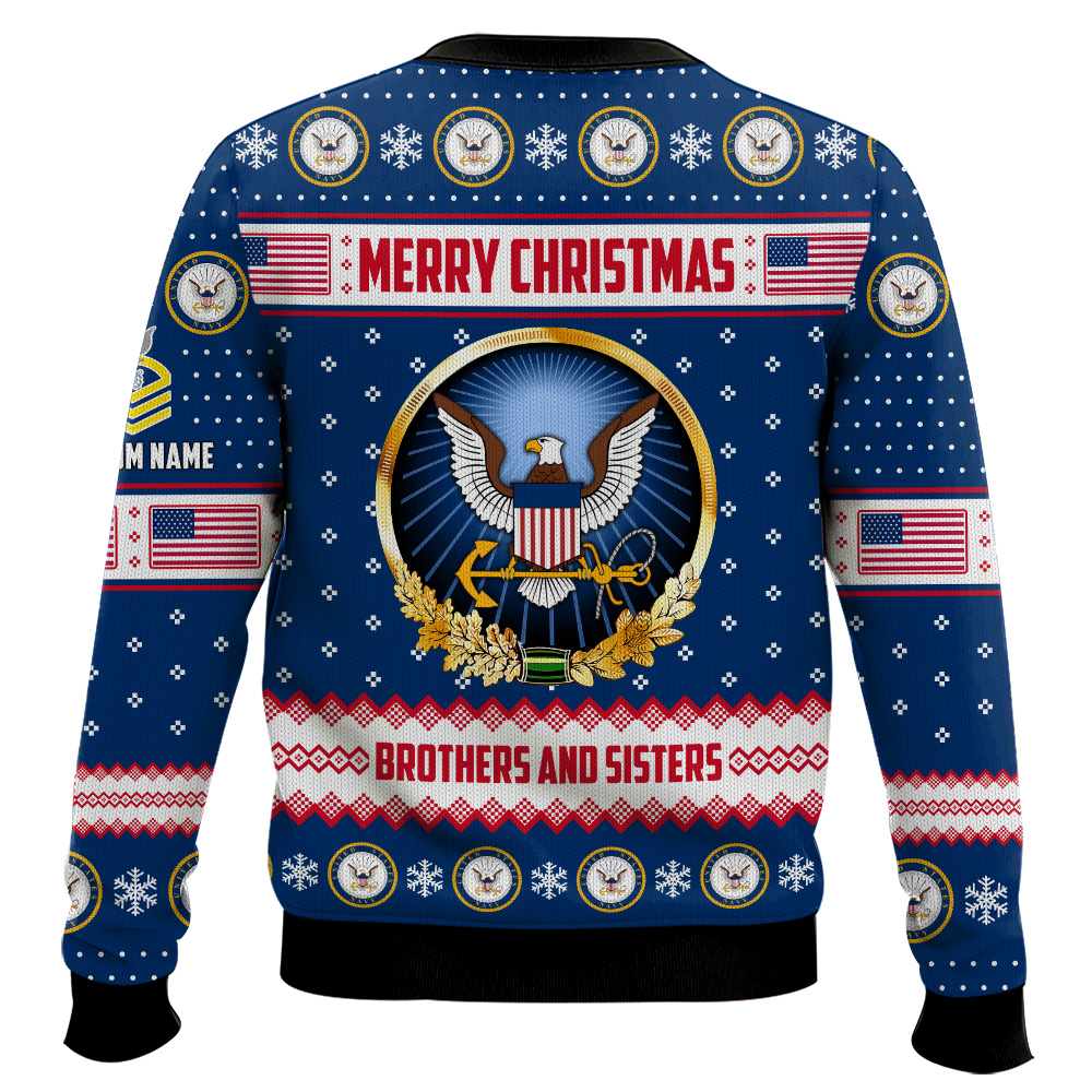Hooktab US Navy Merry Christmas Brothers And Sisters – Custom Name And Rank Ugly Sweater