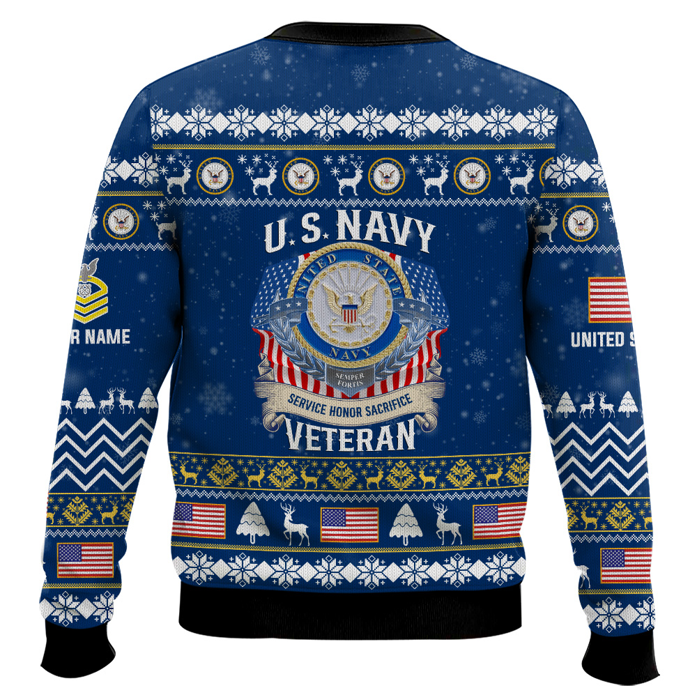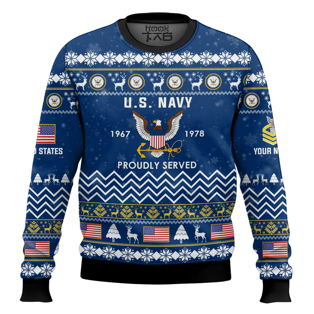 Hooktab US Navy Proudly Served Veteran – Custom Name, Rank And Years Of Service Ugly Sweater